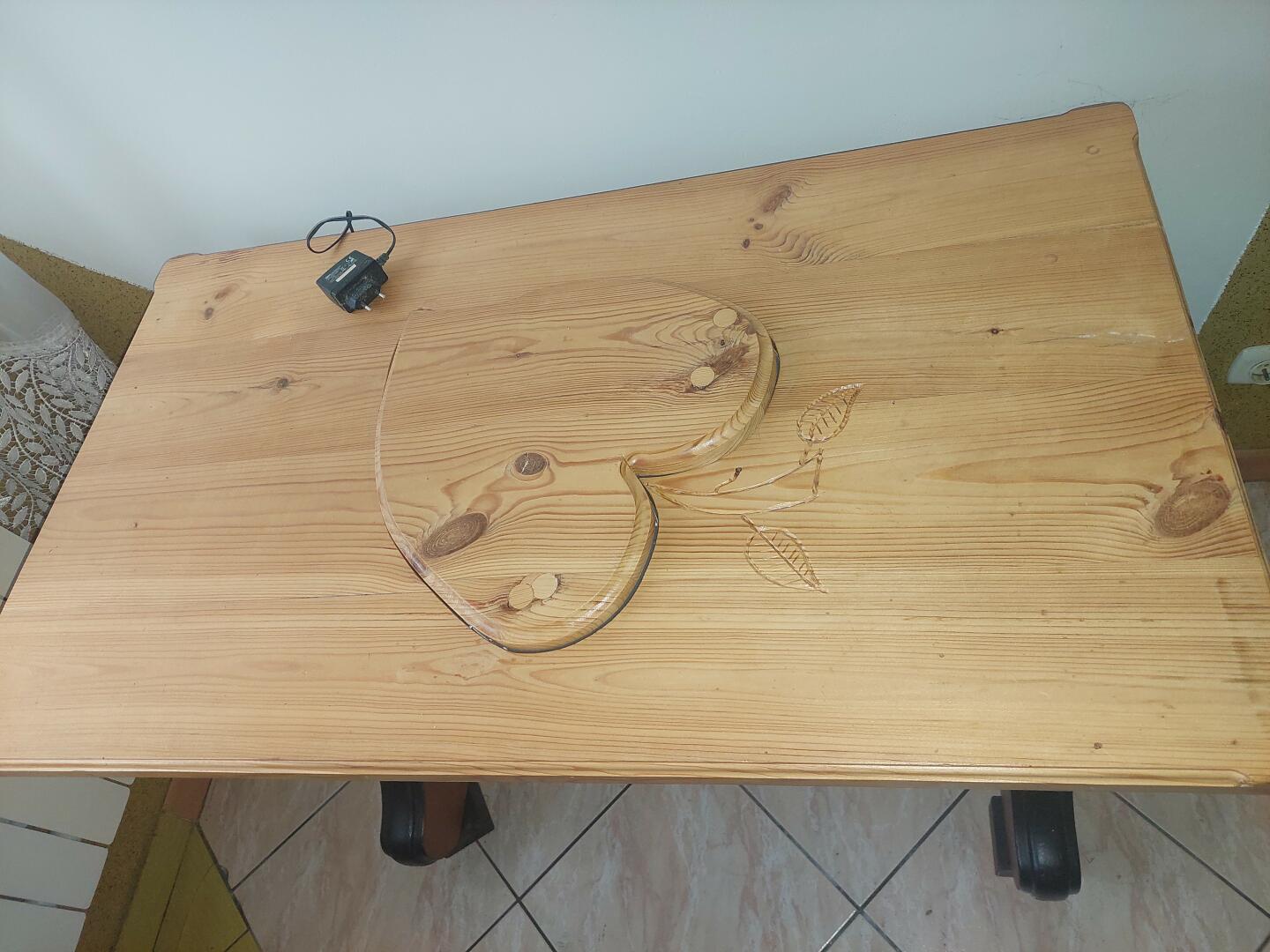 Stół posiada w blacie ozdobne ledowe podświetlenie w to miejsce można włożyć z drewna liść który może służyć jako podstawa po coś , nogi posiadają regulację poziomowania