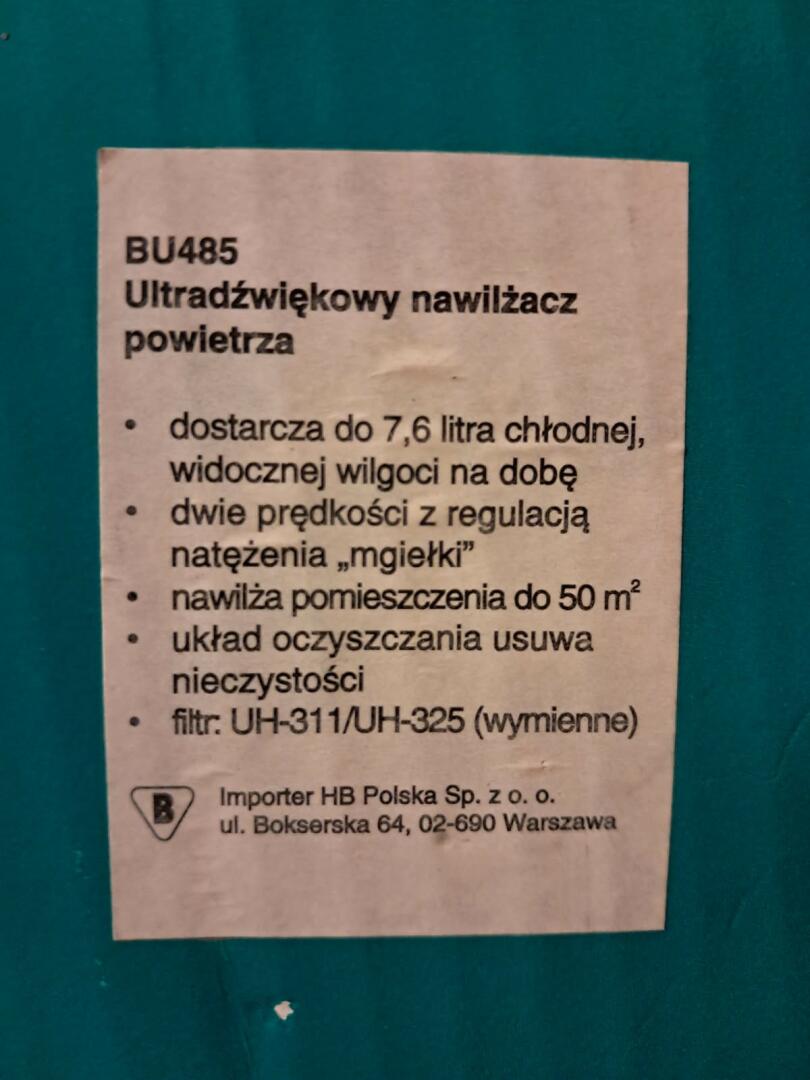 Sprzedam ultradźwiękowy nawilżacz powietrza BIONAIRE, model BU485 widoczny na zdjęciach, nieduży, kompaktowy, stan bardzo dobry, prawie nieużywany, oryginalnie opakowany, w komplecie instrukcja, karta gwarancyjna, dostarcza do 7.6 litra chłodnej wilgoci na dobę, dwie prędkości nawilżania z regulacją natężenia "mgiełki", nawilża skutecznie pomieszczenia do 50 m2, układ oczyszczania usuwa nieczystości, posiada wymienny wkład filtrujący, możliwość dodania olejków zapachowych do wody, bardzo cicha praca idealne do pokoi dziecięcych, salonów i biura.