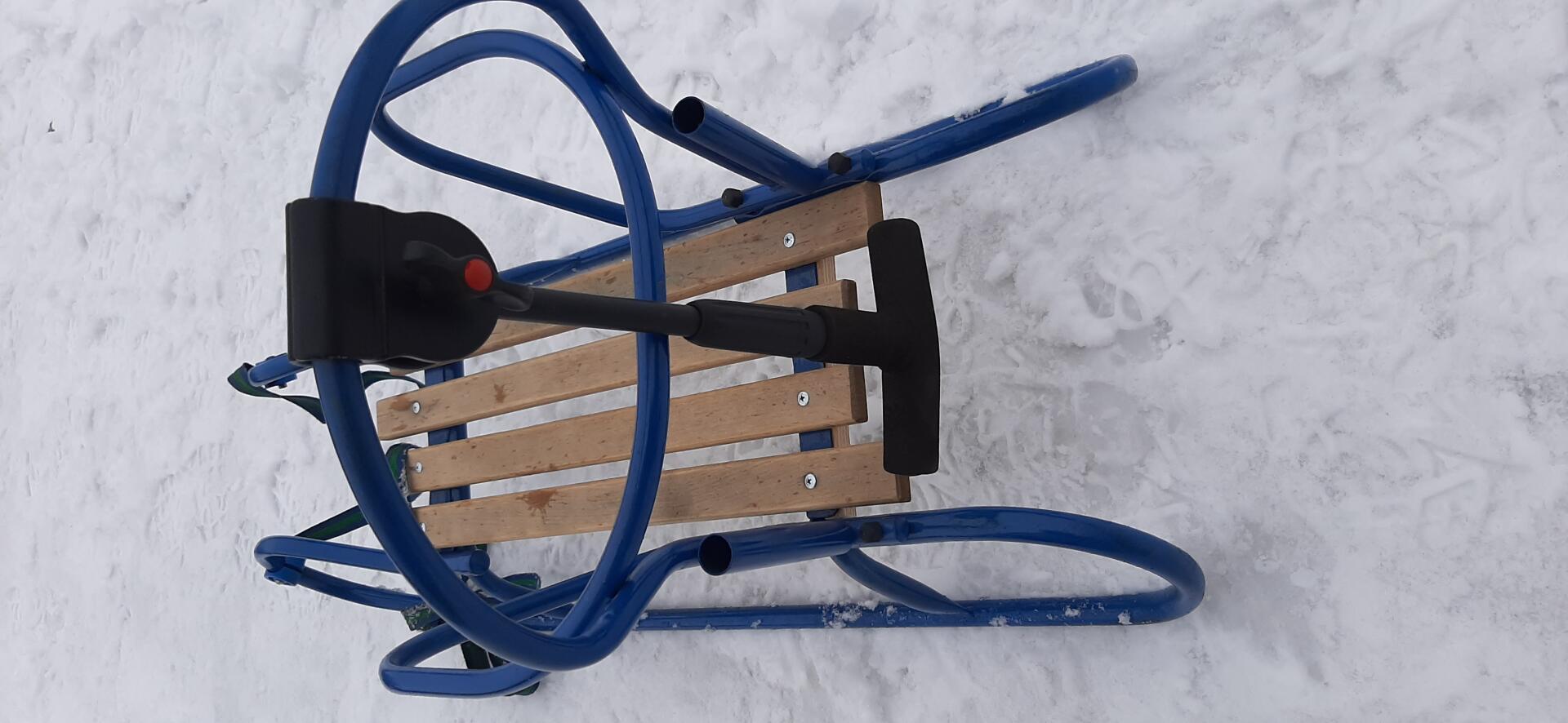 Jest nareszcie prawdziwa zima więc mam prawie nowe metalowe sanki które to posiadają odpinane oparcie oraz zamontowany jest też pchacz który to pomaga w sterowaniu sankami będąc z tyłu pociechy siedzącej przed nami , więc dziecku nie będziemy przeszkadzali w podziwianiu zimowej aury z przodu , jest również taśma do ciągnięcia sanek